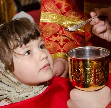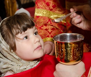 What is Holy Communion? It is the partaking of the Body and Blood of our Lord Jesus Christ, which unites us to Him. Christ Himself commanded us to do this at the Last Supper. Through the prayers of the priest and the descent of the Holy Spirit, bread and wine are mystically changed into the Body and Blood of Christ. All Orthodox Christians from babies to adults may receive Holy Communion.